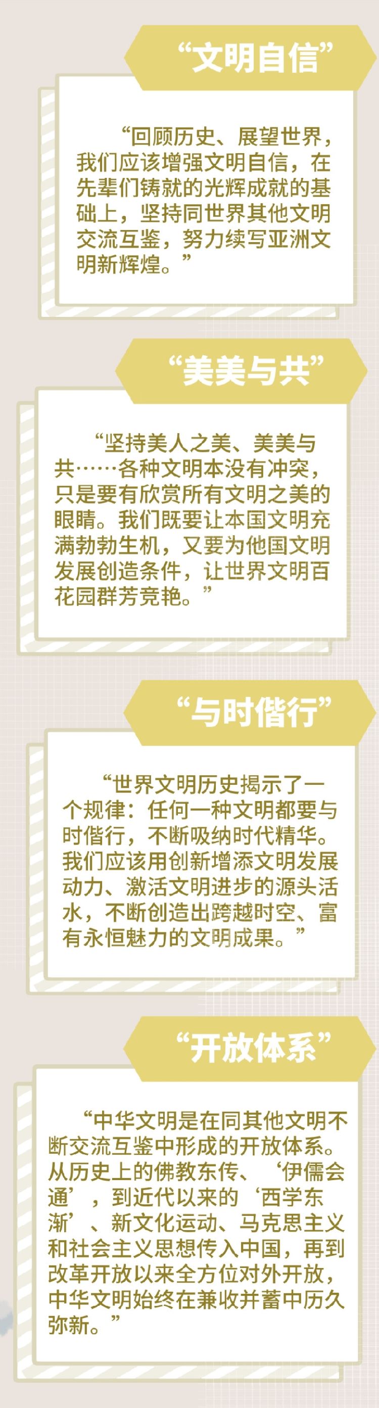 总结亚洲辉煌的文明成果,阐释中华文明深刻内涵,介绍不同文明“相处之道”,并提出亚洲人民三个期待和加强世界上不同国家、不同民族、不同文化交流互鉴的四点主张……