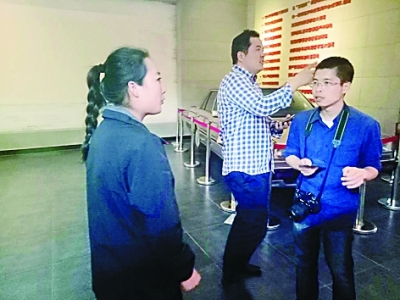 光明日报记者周洪双(右一)在“两弹城”采访。光明图片