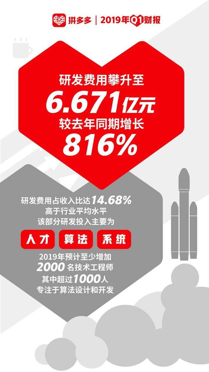 财报显示,2019年第一季度,拼多多研发费用攀升至6.671亿元,较去年同期增长816%。平台研发费用占收入比达14.68%,高于行业平均水平。该部分投入主要为人才、算法、系统等“无形资产”,固定资产仅占极小比例。