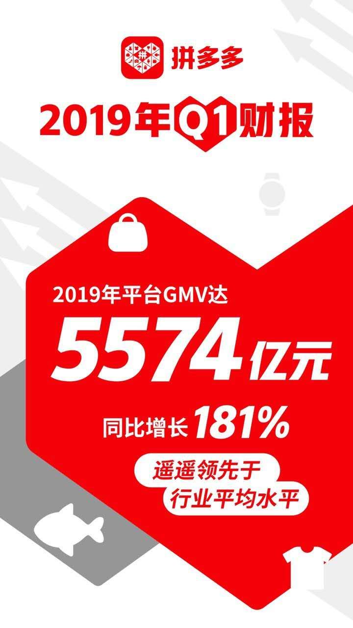 北京时间5月20日,新电商平台拼多多(NASDAQ:PDD)发布的2019年第一季度财报显示:截至2019年3月31日的12个月期间,平台GMV达5574亿元,较去年同期的1987亿元同比增长181%;Q1季度,平台实现营收45.452亿元,较去年同期的13.846亿元同比增长228%;截至3月底,平台年活跃买家数达4.433亿,较去年同期的2.949亿净增1.484亿,同比增长超过50%;Q1季度,拼多多移动客户端平均月活用户达2.897亿,较去年同期的1.662亿净增1.235亿,同比增长超过74%;平台活跃买家年度平均消费额进一步增长至1257.3元,较去年同期的673.9元同比增长87%。