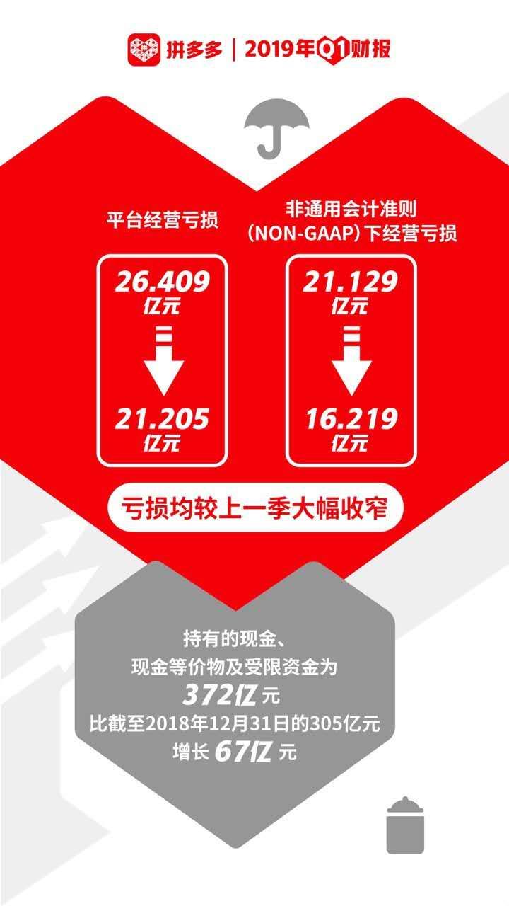 截至2019年3月31日,拼多多持有的现金及现金等价物及受限资金为372亿元,较截至2018年12月31日的305亿元增长67亿元。剔除受限现金,拼多多持有现金和现金等价物225亿元,此外,平台还有69亿元资金用于短期投资项目。