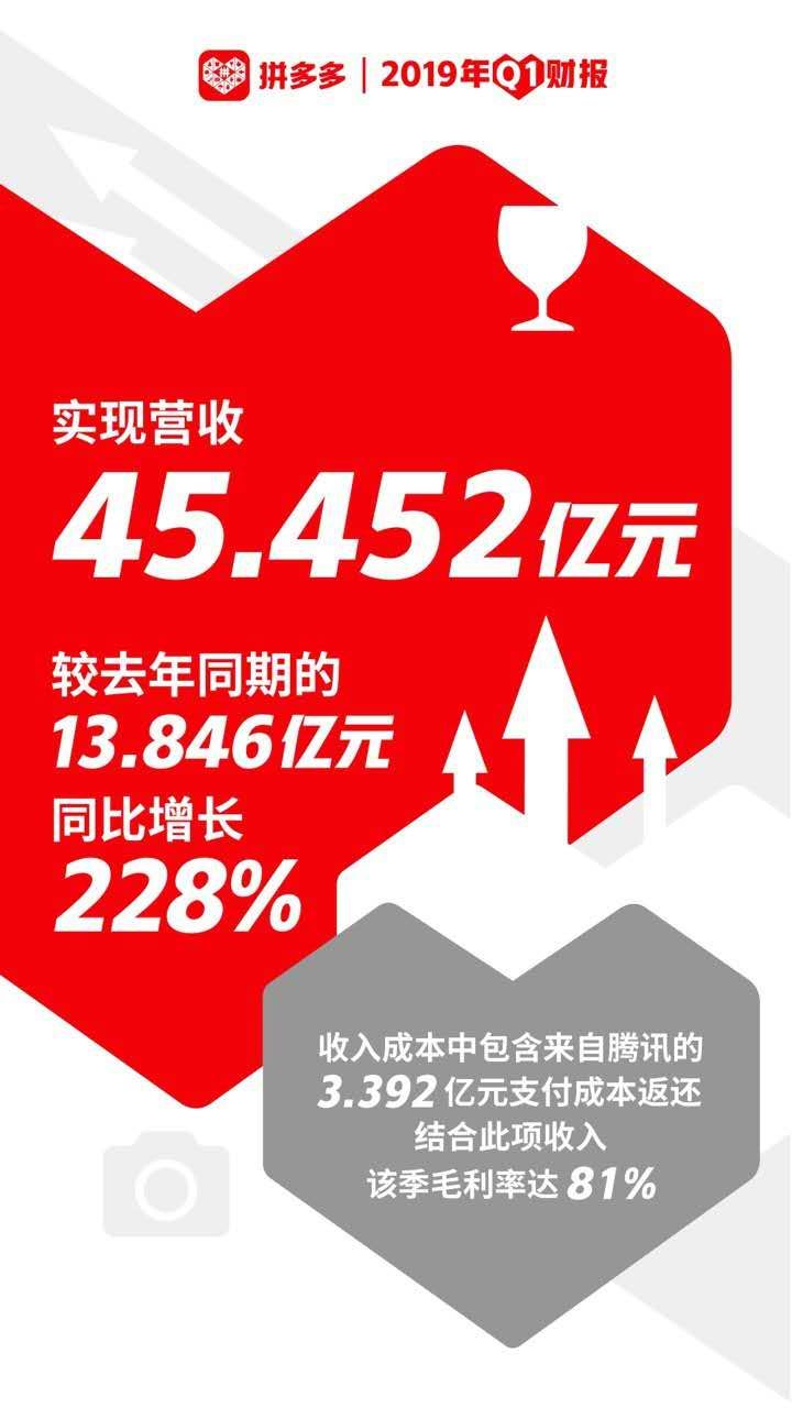 高用户活跃度以及领先的购买转化率,带动拼多多营收实现快速增长。2019年Q1季度,拼多多实现营收45.452亿元,较去年同期的人民币13.846亿元同比增长228%,高于市场普遍预期。
