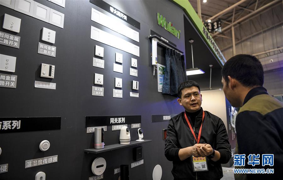 在乌鲁木齐举办的首届新疆智能产业博览会上,一名参展商代表向参观者介绍智慧家居产品(5月17日摄)。新华社记者 王菲 摄