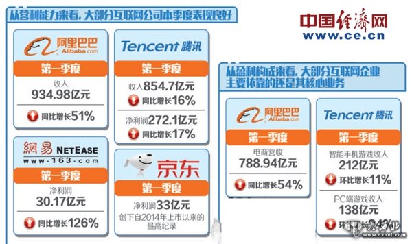阿里巴巴新一季度收入达934.98亿元,同比增速高达51%,实现利润251.7亿元;腾讯第一季度实现营收854.7亿元,同比增长16%,净利润为272.1亿元,同比增长17%;网易第一季度净利润30.17亿元,同比增长高达126%;京东第一季度净利润33亿元,创下自2014年上市以来的最高纪录。