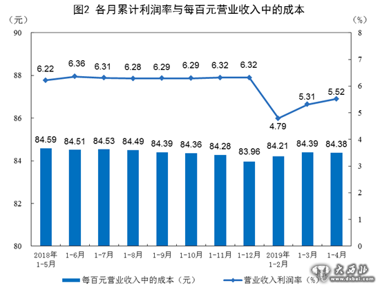 1—4月份,规模以上工业企业每百元营业收入中的成本为84.38元,同比增加0.22元;每百元营业收入中的费用为8.73元,同比增加0.24元。