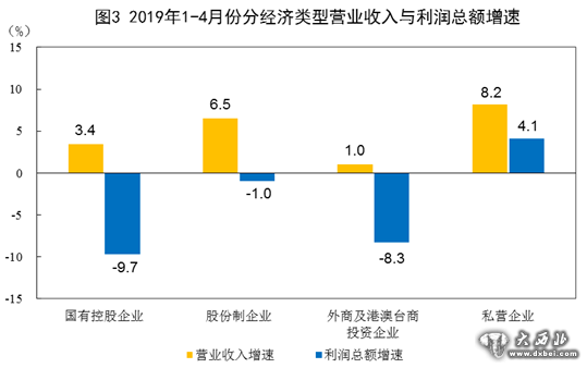 1—4月份,规模以上工业企业中,国有控股企业实现利润总额5704.3亿元,同比下降9.7%;股份制企业实现利润总额12873.3亿元,下降1.0%;外商及港澳台商投资企业实现利润总额4455.2亿元,下降8.3%;私营企业实现利润总额4597.1亿元,增长4.1%。