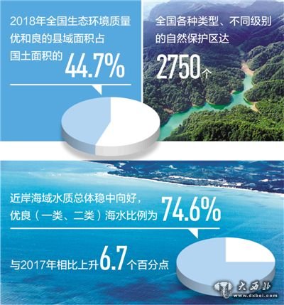 会上,生态环境部生态环境监测司司长柏仇勇表示,2018年全国生态环境质量持续改善,大气和水环境质量进一步改善,土壤环境风险有效管控,生态系统格局整体稳定,主要污染物排放总量和单位国内生产总值二氧化碳排放量进一步下降,完成生态环境保护年度目标任务;海洋生态环境状况整体稳中向好,海水环境质量总体有所改善。