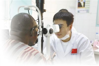 第十七批援塞内加尔医疗队队员正在给当地患者检查眼睛。 本报记者 吕 强摄