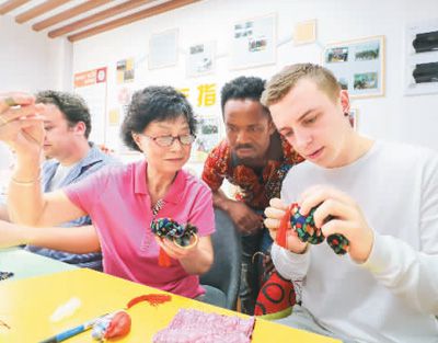 6月4日,浙江省德清县武康街道吉祥社区,外国友人在社区居民指导下制作香囊。王 正摄 (新华社发)