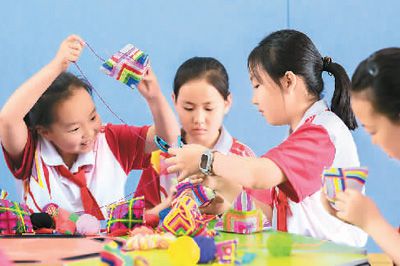 6月4日,内蒙古呼和浩特市玉泉区恒昌店巷小学学生在制作“彩粽”香包。丁根厚摄(人民图片)