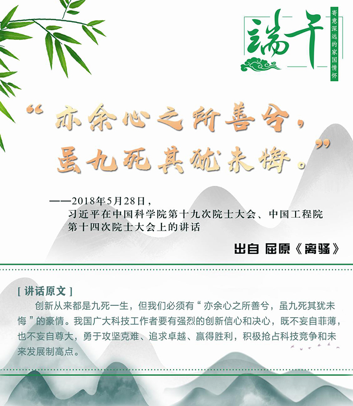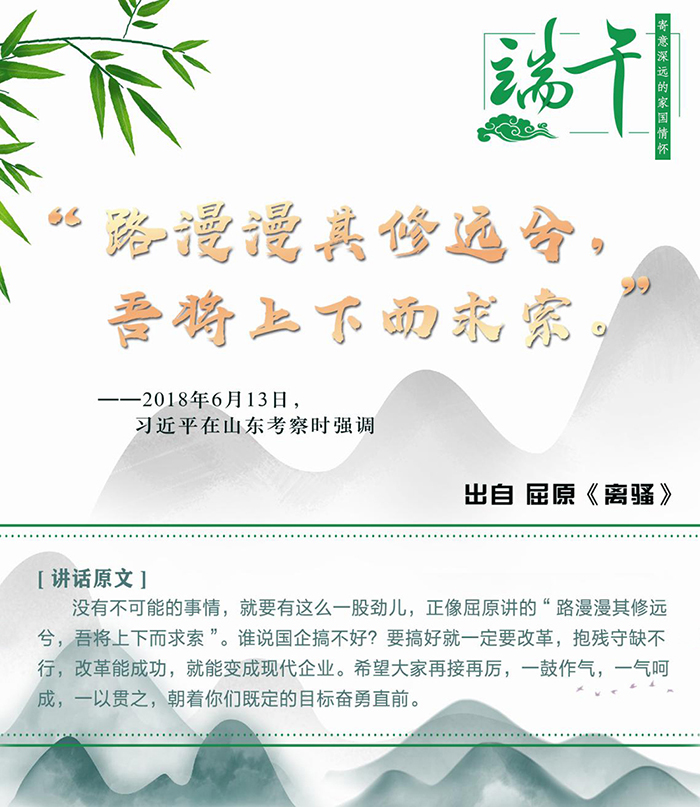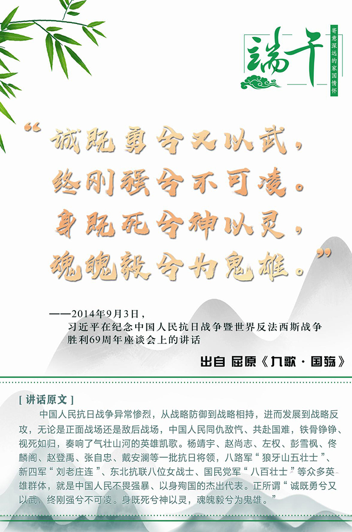 千百年来,端午节与端午文化凝结着中华民族的文化血脉和思想精华,端午二字也已成为传承、弘扬、激发民族精神和爱国情感的载体,是有着符号意义的“根”。这一天,人们纷纷纪念屈原,在思接千古的家国情怀中积蓄前行的力量。习近平总书记曾在不同场合多次提及屈原,并引用屈原诗歌中的名句阐述思想,寄意深远。今天,让我们重温习总书记平实的话语,来一场感受中华文化深厚底蕴的寻“根”之旅——去找寻古人精神与当下需求的连接点,感受中华民族传统风骨中的爱国主义精神,思考民族精神的传承、发展与创新。