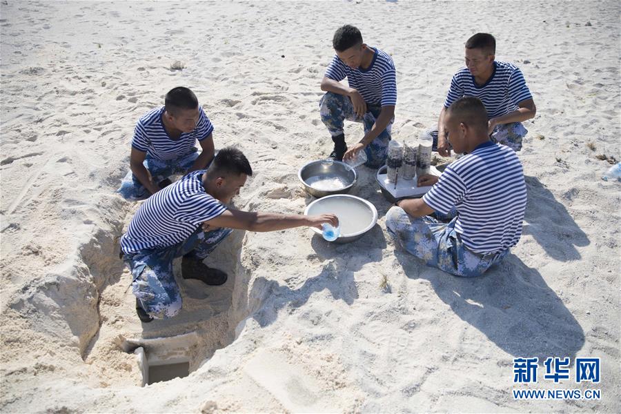 中建岛守备营官兵在野外生存训练中挖岛水过滤(5月22日摄)。新华社记者 琚振华 摄