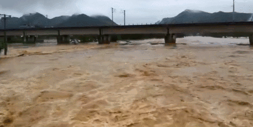 全州县万乡河大桥被夹杂着大量树枝、泡沫、塑料的洪水淹没。