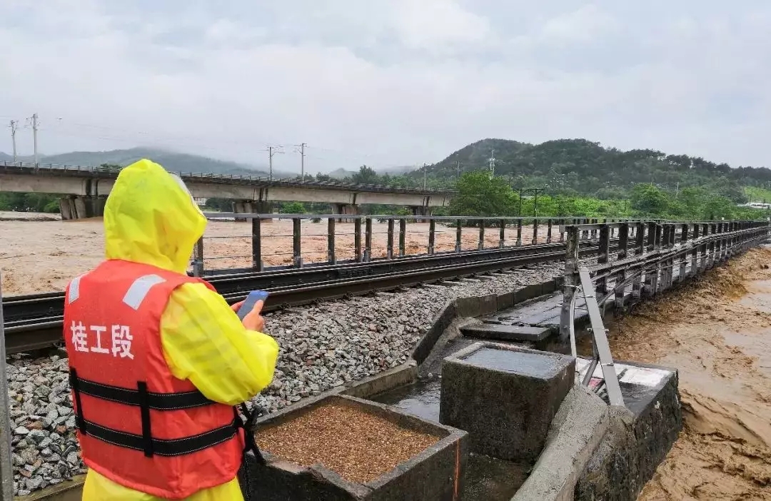 面对突如其来的暴雨,桂林工务段干部职工紧急出动,第一时间携抢险机具材料赶赴现场,部署应急措施,展开抢险救援。他们实时监测水位变化,应对突发险情。