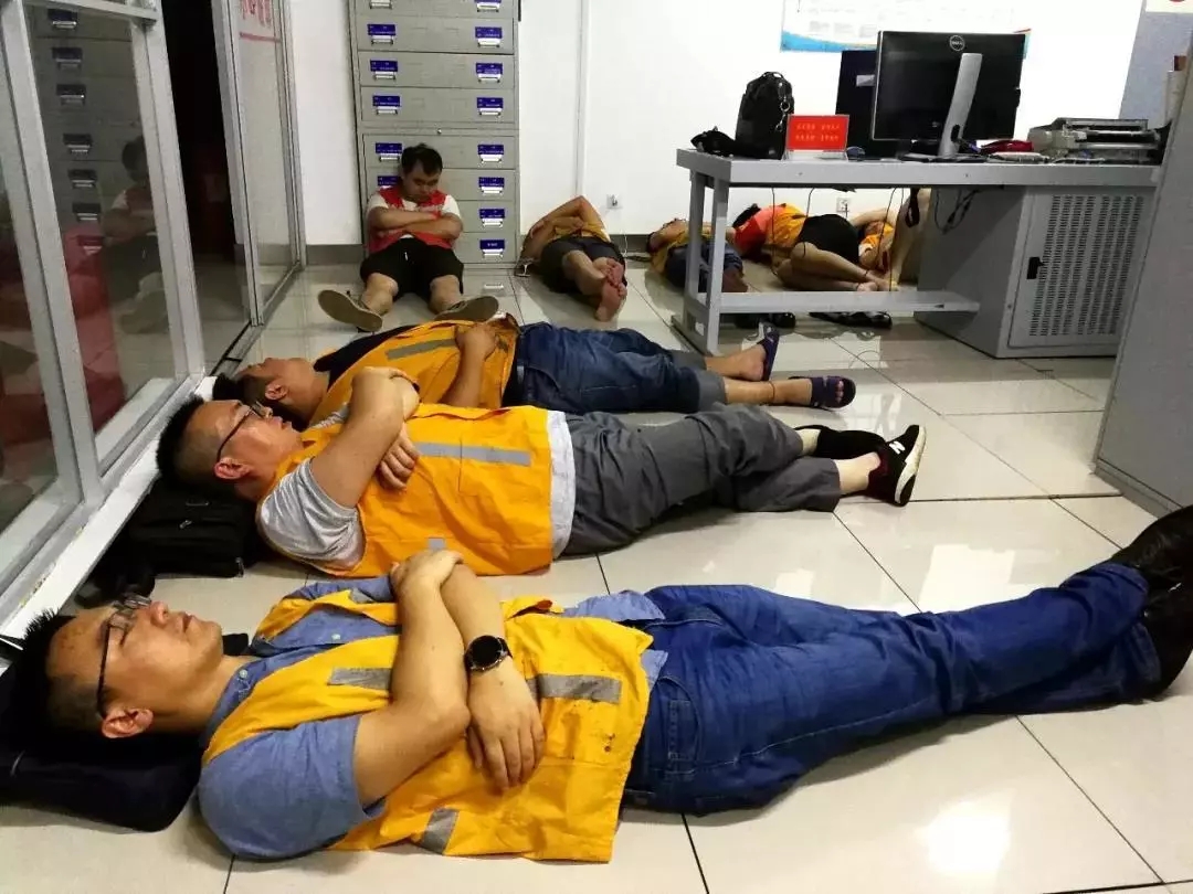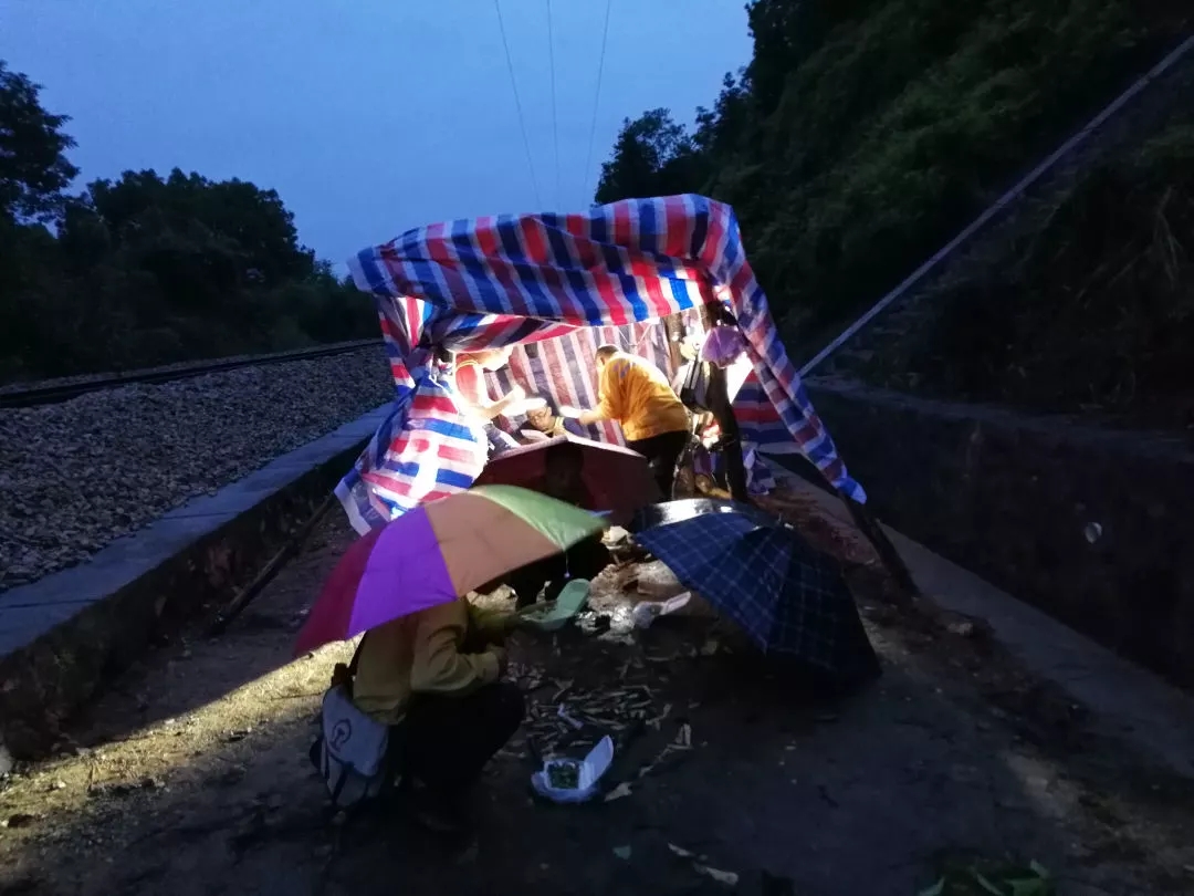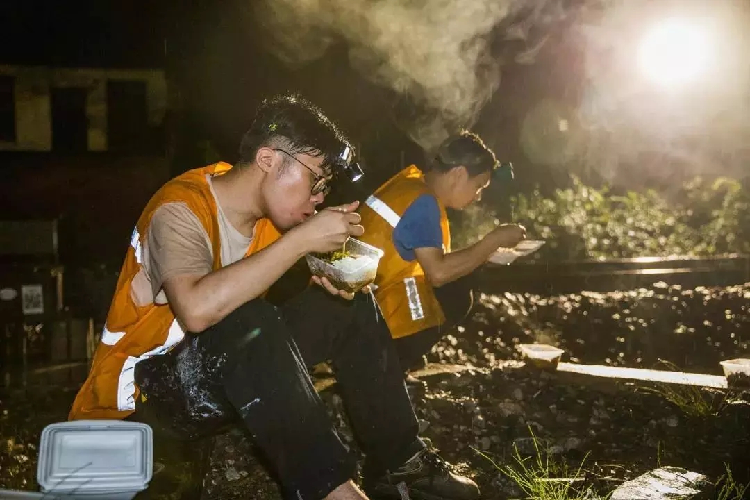 全州站内股道被洪水淹没,工作人员接到当晚开通正线的命令后,从下午4点抢修设备直至深夜,终于顺利完成了任务。此时,他们才有空匆匆吃上盒饭,在地上和衣而眠。