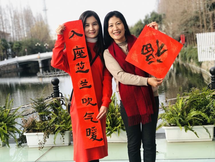 2019年初,努利亚(左)与中国老师参加留学生庆祝春节活动。“福”字为努利亚书写。新华社发