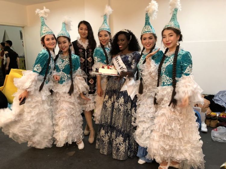 2018年12月,努利亚(左一)等吉尔吉斯斯坦留学生身着民族服装,参加华师大中外服饰文化节活动。新华社发