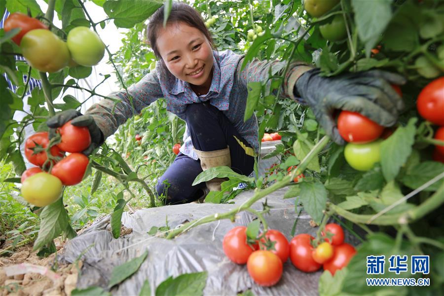 6月24日,贵州省毕节市黔西县文峰街道田坎社区农民在采摘西红柿。 新华社发(周训超 摄)