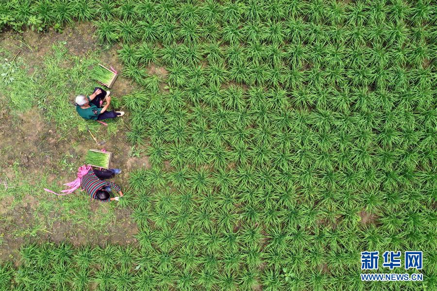 6月24日,贵州省毕节市黔西县洪水镇永平村村民在收割韭菜(无人机拍摄)。 新华社发(胡攀学 摄)