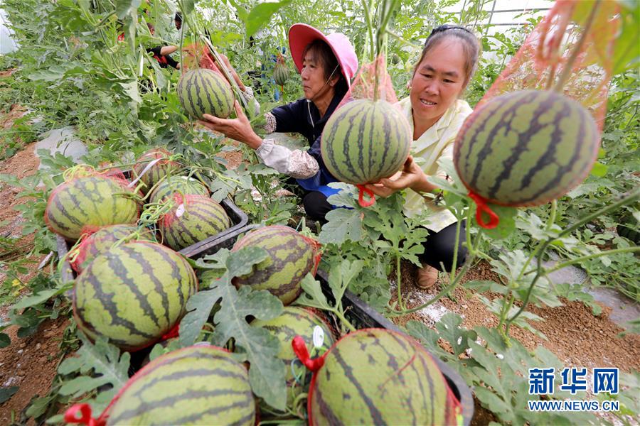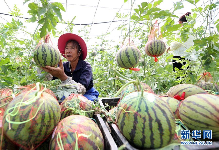 6月24日,贵州省毕节市黔西县文峰街道双星社区村民在采摘西瓜。 新华社发(韩贤普 摄)