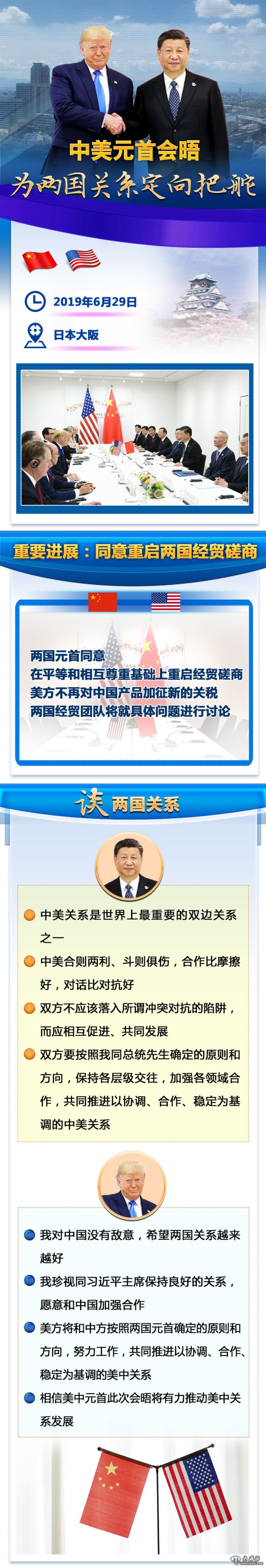 举世瞩目的中美元首会晤,于6月29日在日本大阪举行。国家主席习近平同美国总统特朗普就事关中美关系发展的根本性问题、当前中美经贸摩擦以及共同关心的国际和地区问题深入交换意见,为下阶段两国关系发展定向把舵,同意推进以协调、合作、稳定为基调的中美关系。