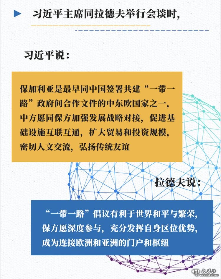 从南亚的孟加拉国,到亚欧交界的土耳其,再到巴尔干半岛的保加利亚,三个国家恰好将亚洲和欧洲——古丝绸之路的两端紧密相连。“一带一路”合作自然成为中外领导人关心的话题:
