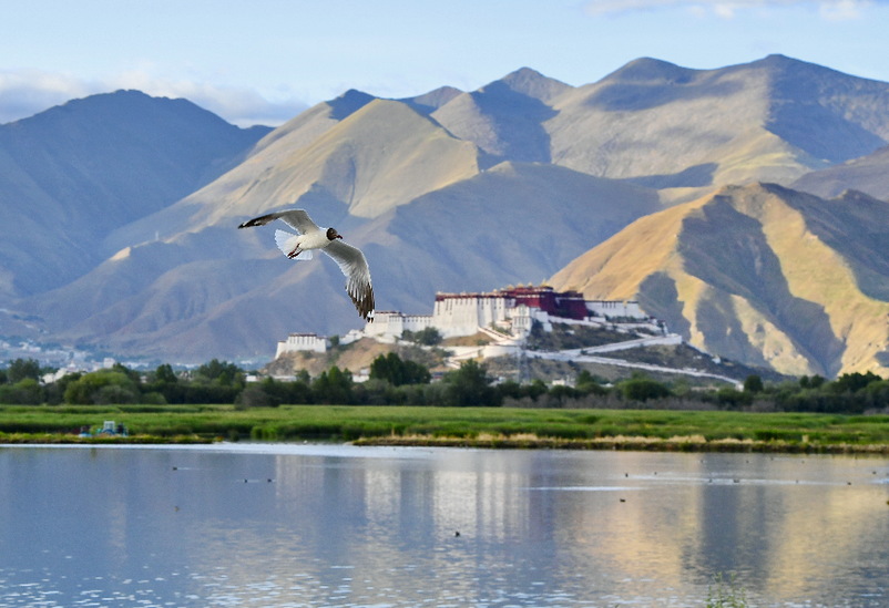 6月27日,一只棕头鸥在拉鲁湿地上空盘旋。新华社记者张汝锋摄
