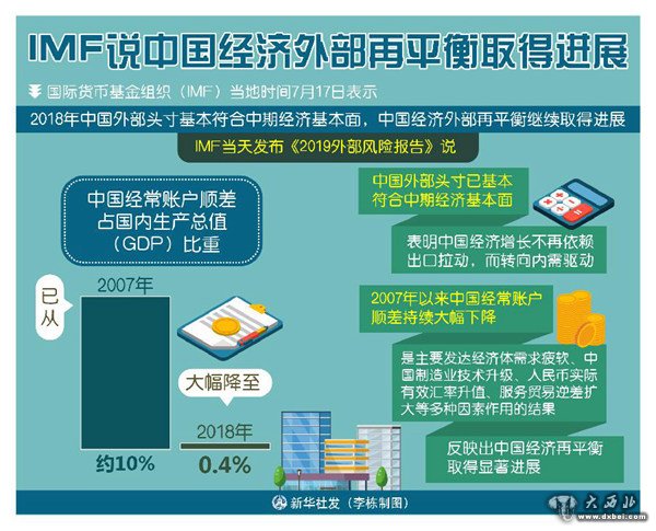 IMF当天发布《2019外部风险报告》说,中国经常账户顺差占国内生产总值(GDP)比重已从2007年的约10%大幅降至2018年的0.4%,中国外部头寸已基本符合中期经济基本面,表明中国经济增长不再依赖出口拉动,而转向内需驱动。