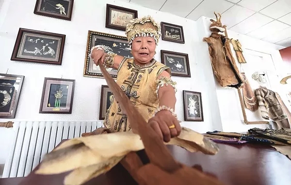 ▲赫哲族老艺人尤秀云在黑龙江省同江市八岔文化活动中心展示鱼皮衣制作过程。新华社发