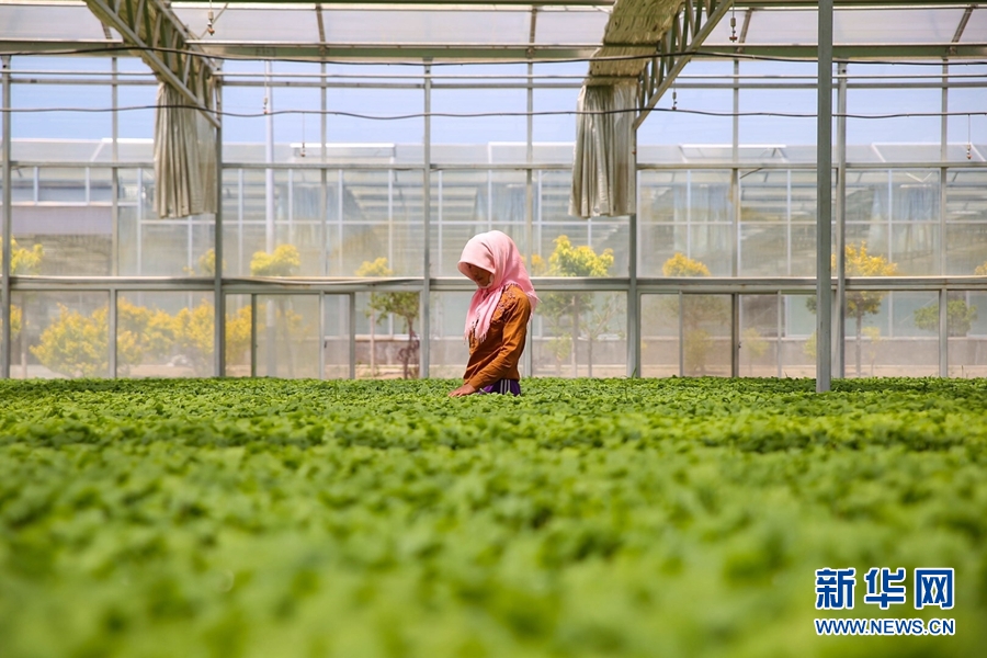 姚磨蔬菜产融合示范园内,一名工作人员在检测蔬菜品种(7月6日拍摄)。新华网肖寒摄