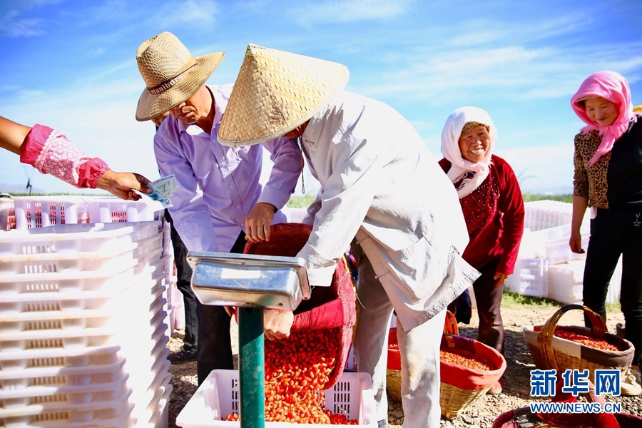 这位老农一筐采摘了16斤鲜枸杞,工作人员现场称重并结清16元报酬(7月7日拍摄)。新华网肖寒摄