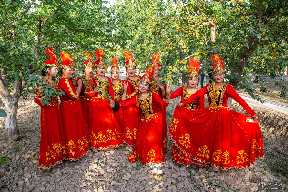 巴治州轮台县哈尔巴克乡卡西比西村,村民舞蹈队正在舞台边的果园里候场,当晚在村里的文化广场将会举行一场文艺演出。