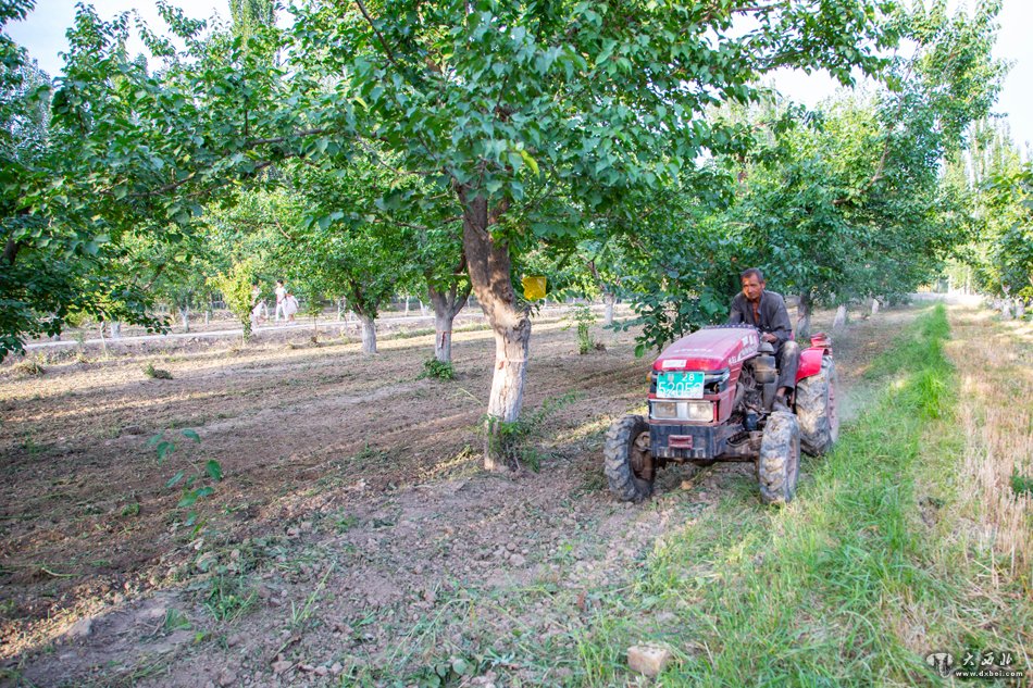 一位村民在自家的果园里开着拖拉机为果树松土除草。