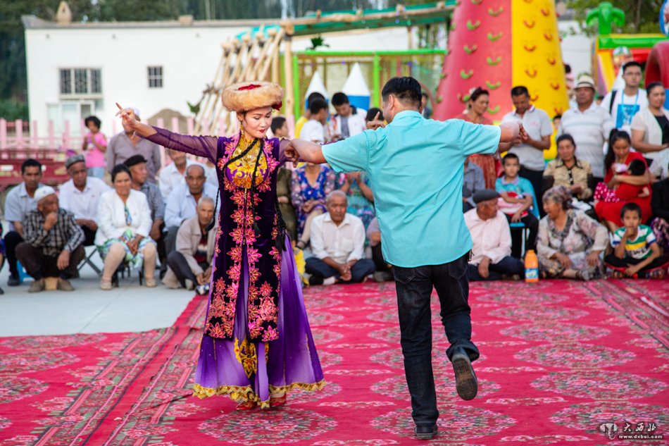 “杏花村”的文化广场正在举行一场文艺表演,两名舞者在舞台中央载歌载舞。