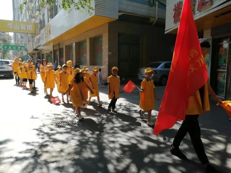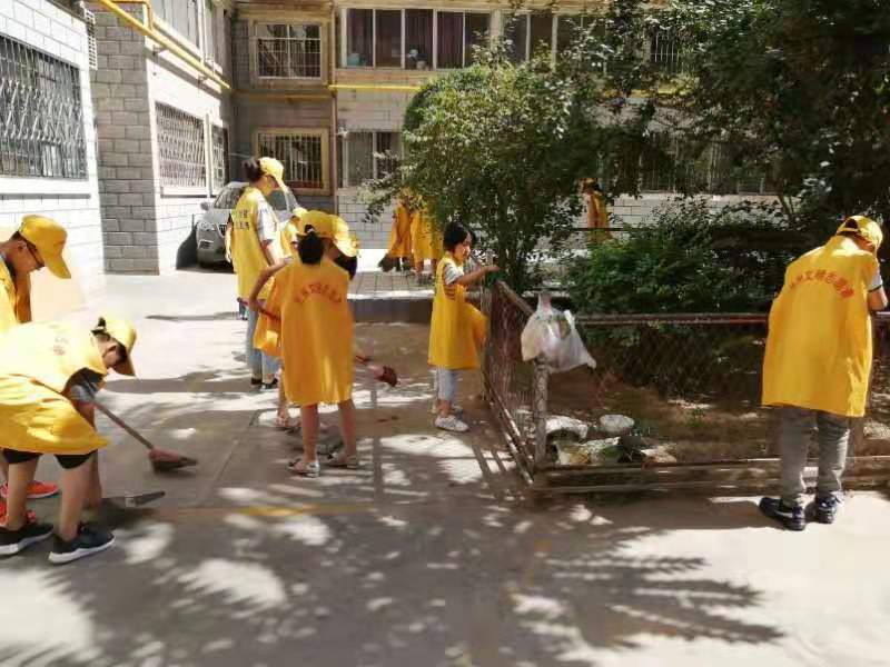 上午10时许,孩子们身着统一服装在社区工作人员带领下,拿着抹布、铁铲、捡垃圾钳、扫帚等工具,走进同学们自己生活的辖区小区里清扫垃圾。