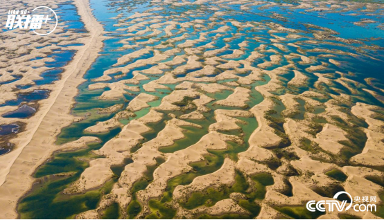 湖泊星罗棋布,黄沙中绿树成荫,牛羊悠然自得,河流弯弯曲曲通向远方,这是内蒙古自治区鄂尔多斯市一处沙漠中的别样景象。