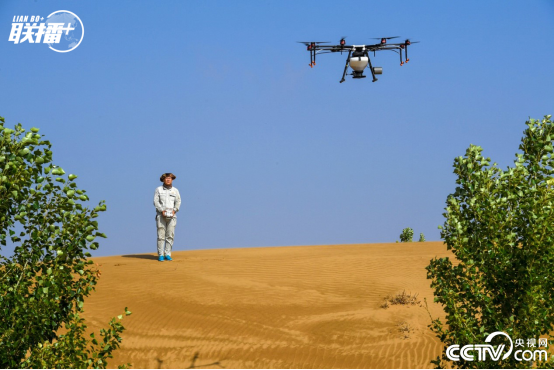 在内蒙古鄂尔多斯市杭锦旗的库布其沙漠中,技术人员操控无人机飞播造林。