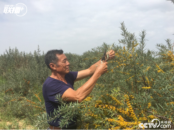 在库布其沙漠中的白土梁林场沙棘林内,林场管理员邓胜利展示沙棘树剪枝育苗技术。当地通过种植沙棘,既解决了荒漠化问题,又帮助农牧民增收,实现了生态和经济双重效益。