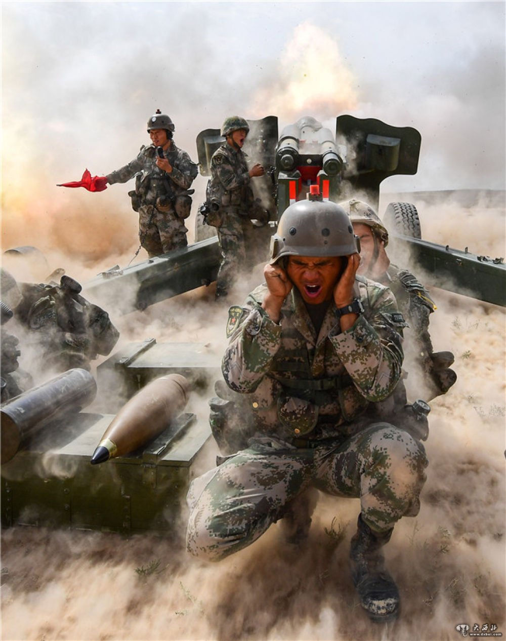 在“火力-2017·青铜峡”基地化训练中,红军参演炮兵部队——第71集团军某炮兵旅加榴炮进行昼间实弹射击(2017年9月24日摄)。新华社发(彭希摄)