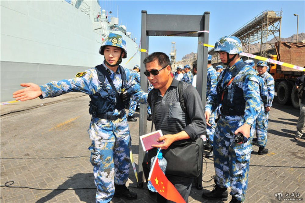 中国海军第十九批护航编队临沂舰抵达也门亚丁港,帮助准备撤离的中国同胞进行安全检查(2015年3月29日摄)。新华社发(熊利兵摄)