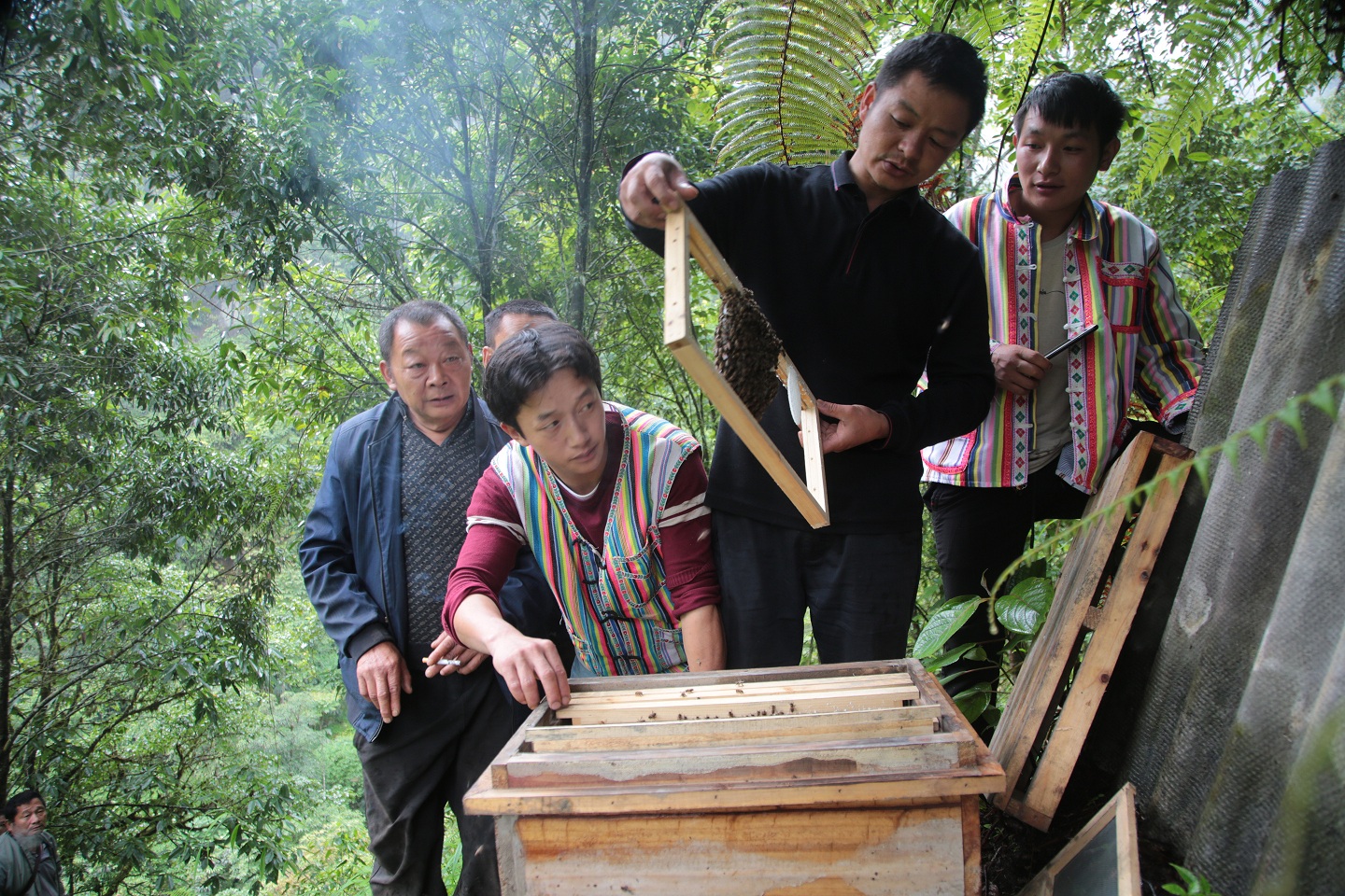 农技专家(右二)给独龙族群众传授规范养蜂技术。王靖生摄