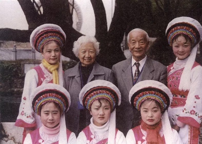 ▲2003年,王希季和夫人聂秀芳在家乡云南大理和白族姑娘合影。新华社供图