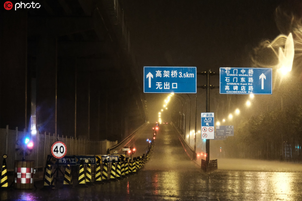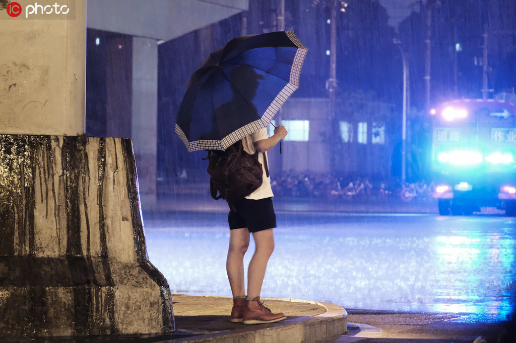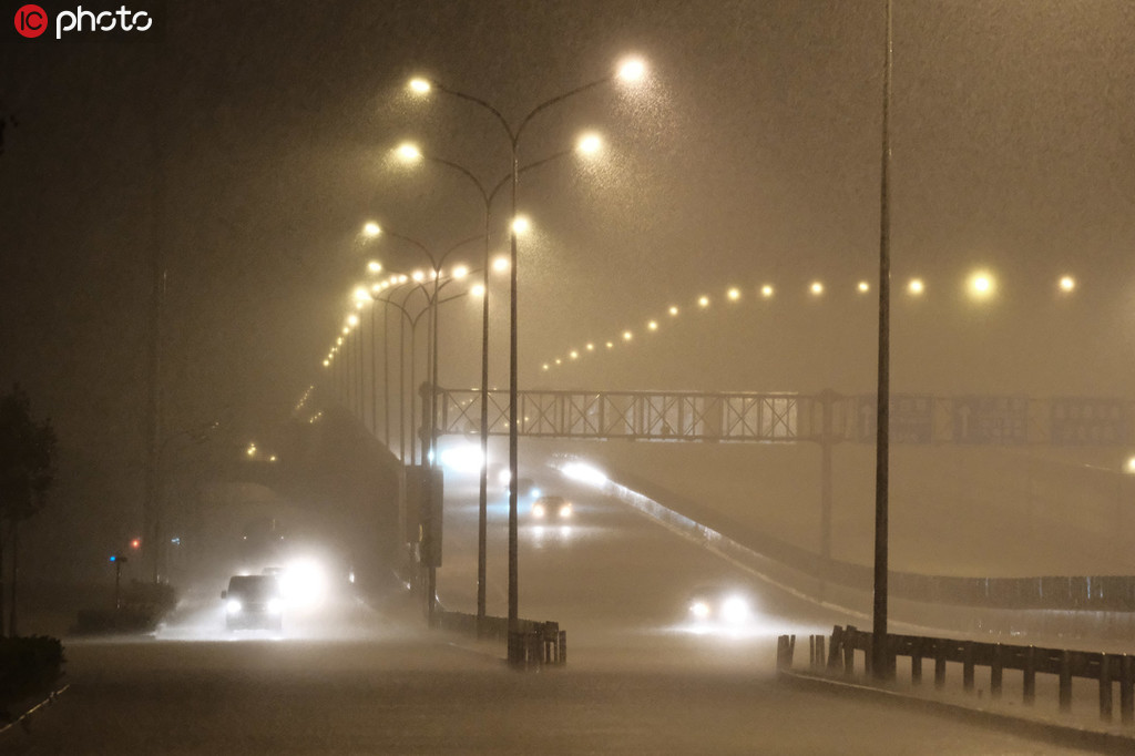 2019年8月7日清晨1点,北京朝阳区,暴雨突袭城区。路上不少市民即使带伞也只能在四环路高架大郊亭桥下躲雨。广渠路五环路附近,车辆雨刮器几乎失效,能见度不足十米,来往车辆纷纷减速慢行。(IC photo)