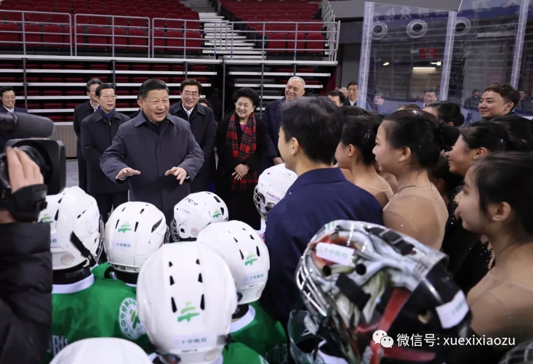 2017年2月24日,北京五棵松体育中心。习近平拉着一位小冰球队员的手,俯下身,与他肩碰肩,做了一个冰球运动“对抗”的姿势。他笑着说,小伙子块头要再长大一点,中国冰雪运动寄希望于你们。