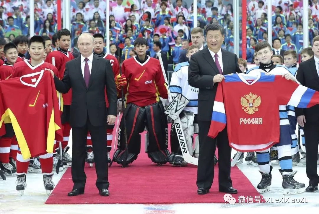 2018年6月8日,天津体育馆。习近平与俄罗斯总统普京一同观看中俄青少年冰球友谊赛,两人在冰场中圈共同为比赛开球。看着小球员在冰场上积极拼抢,习近平对普京说,中俄两国青少年的比赛令人振奋,从中也看到了两国青少年的友谊。