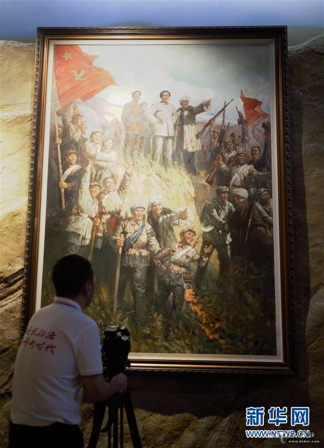 一名记者在中央红军长征胜利纪念馆内拍摄油画作品《三军过后尽开颜》(8月7日摄)。新华社记者罗晓光摄
