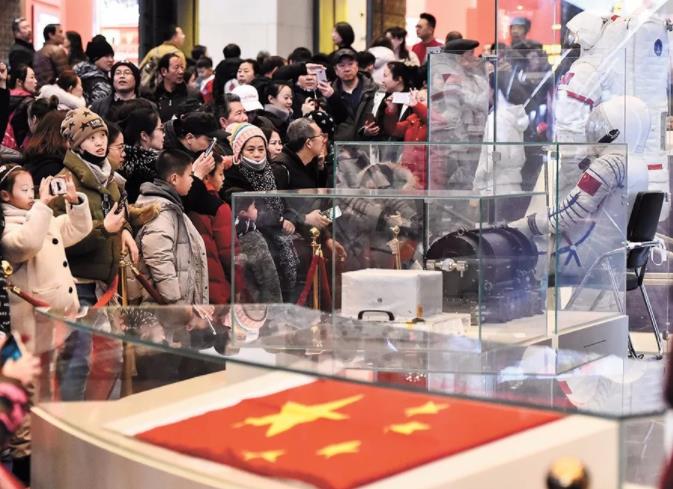 2019年2月10日,“伟大的变革——庆祝改革开放40周年大型展览”航天成就展台前人头攒动。新华社记者 李贺 摄
