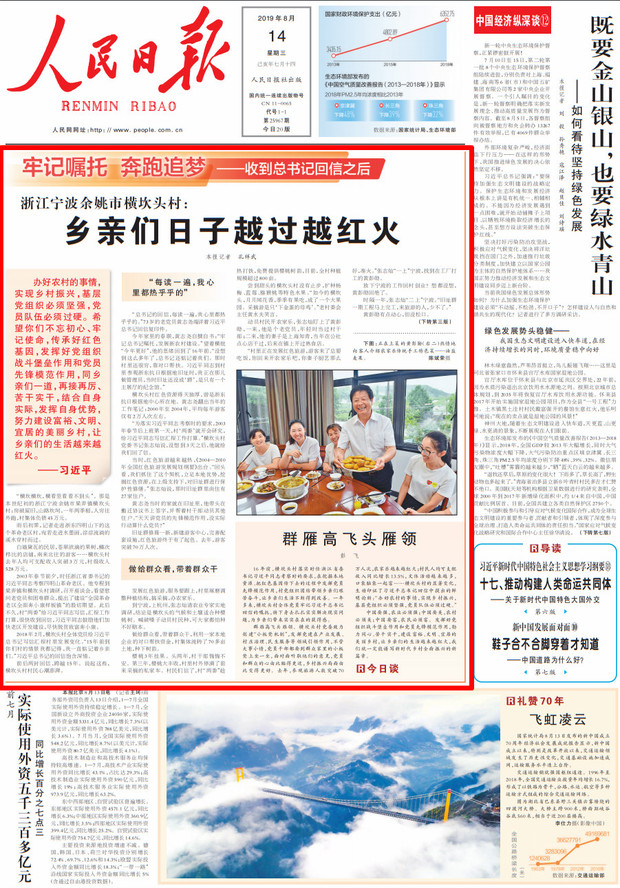 人民日报推出“牢记嘱托奔跑追梦——收到总书记回信之后”系列报道,与您一起见证发展变化、感悟初心使命。今天刊发第十二篇《浙江宁波余姚市横坎头村:乡亲们日子越过越红火》。
