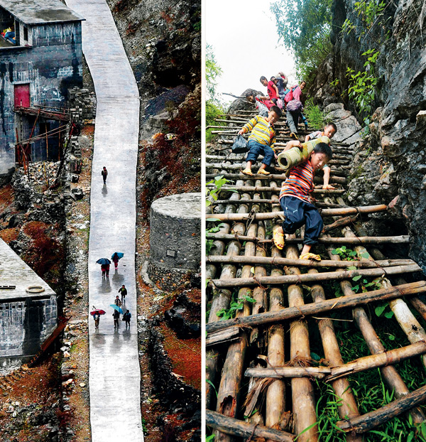 随着脱贫攻坚工作的深入推进,原本“千重山,万层岭,不通水,不通电”的广西大石山区发生了翻天覆地的变化。右图为广西大化瑶族自治县板升乡弄勇村弄顶屯的孩子们,在陡峭的小道上扛着生活用具去学校(2012年9月3日摄),左图为已从学校修通到家门口的水泥路(2017年1月11日摄)。 新华社记者 黄孝邦/摄