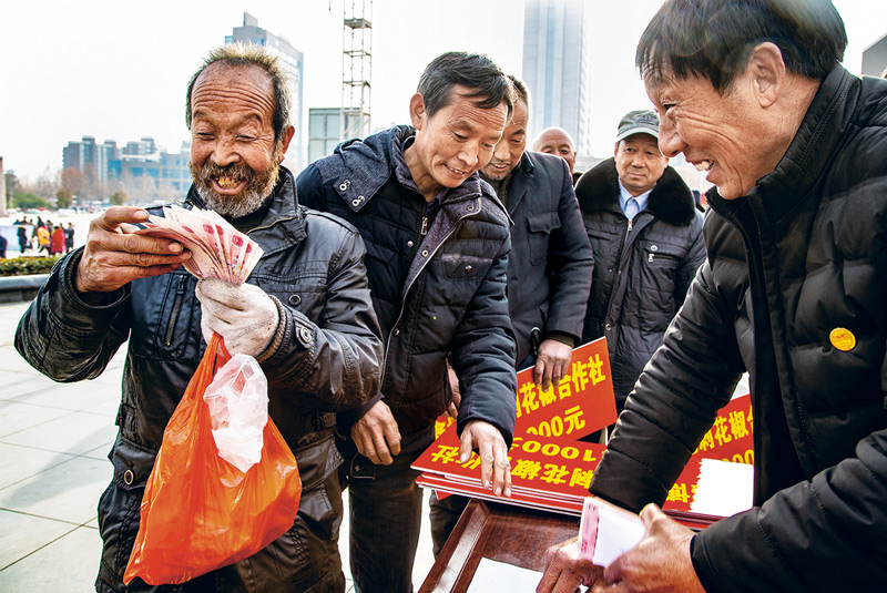 河南省三门峡市卢氏县是国家级贫困县、秦巴山区集中连片特困地区扶贫开发重点县。近年来,卢氏县全力推进精准扶贫、精准脱贫,2018年有29100人稳定脱贫,60个贫困村达标退出。图为花椒合作社社员在产业分红大会上领取分红款。 国务院扶贫办供图 聂金锋/摄